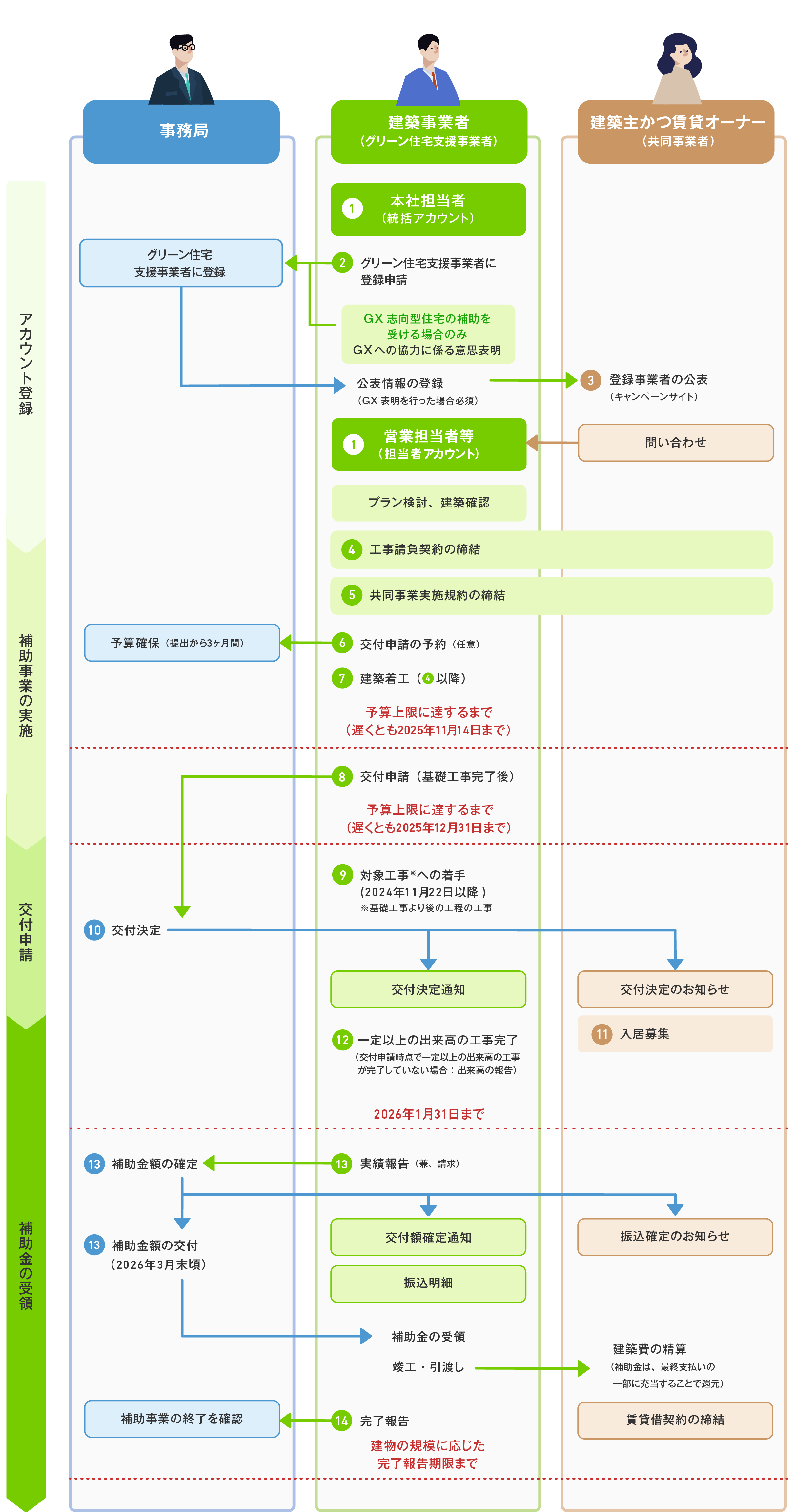 交付申請等の手続きや補助金の建築主かつ賃貸オーナーへの還元は、建築事業者(予め「グリーン住宅支援事業者」としての登録が必要)が行います。