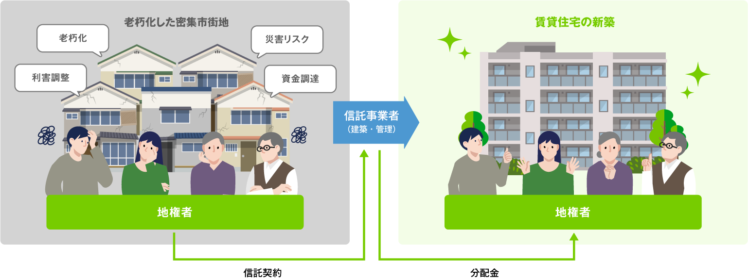 本事業は、国が行う老朽化した建物が密集する市街地の解消に向けた取り組みの一環として、密集市街地の地権者が信託を活用して新築する賃貸集合住宅についても、「賃貸住宅の新築」の補助対象とすることとします。