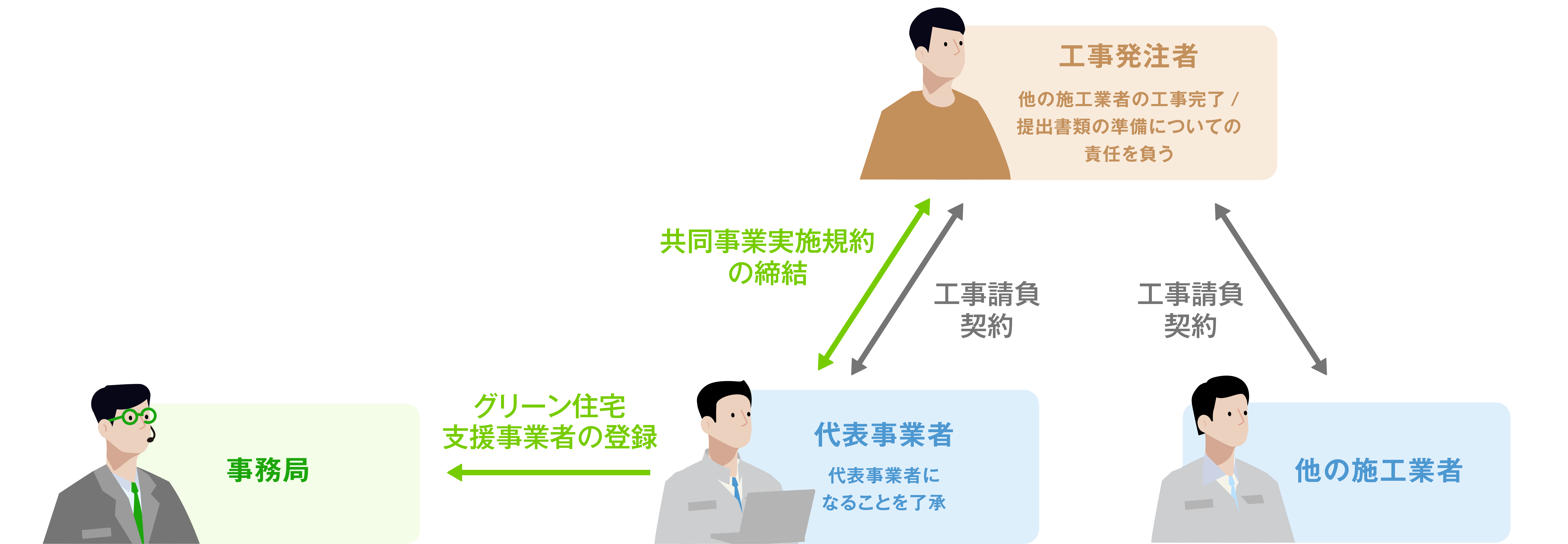 分離発注の場合、工事の発注を受けた施工業者のうちの一社(代表事業者)が、他の施工業者を代表して「グリーン住宅支援事業者」に登録し、 補助金の還元、交付申請等の手続きを行います。